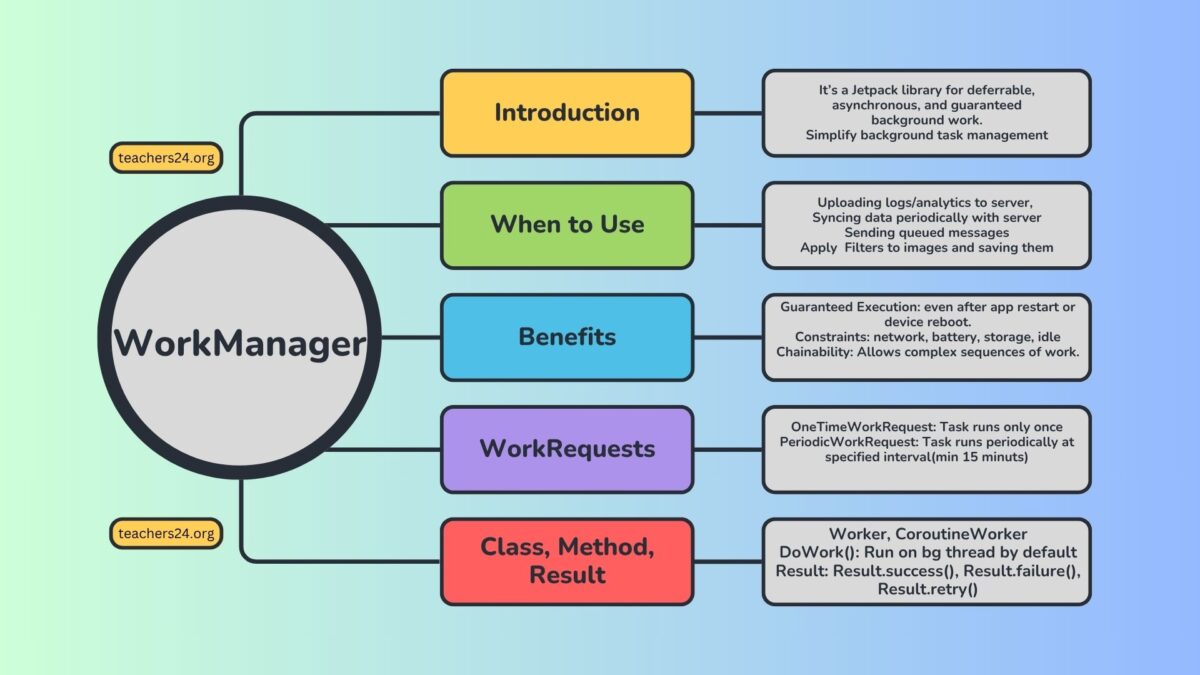 : It’s a Jetpack library for deferrable, asynchronous, and guaranteed background work. It was introduced to simplify background task management and handle various OS restrictions (Doze, App Standby, etc.) across different Android versions, providing a single, consistent API.